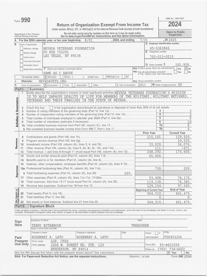 Nevada Veterans Foundation Financial Information NFV public 990 *FY August 1, 2024 to July 31, 2025. NEVADA VETERANS FOUNDATION 45-3363846